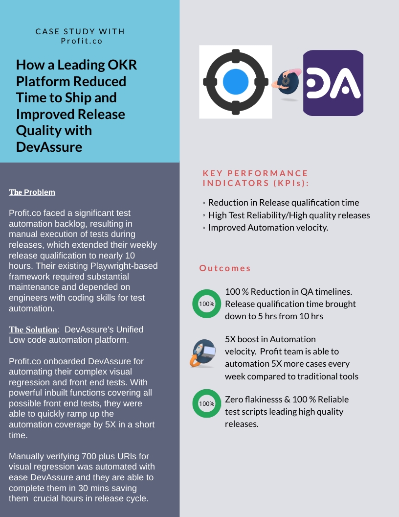 "We've been using DevAssure extensively to test Profit.co, and the impact on our development and release cycles has been significant. From the start, we found the platform to be extremely intuitive—remarkably easy to set up, navigate, and integrate into our existing workflows. What really stands out is how effortlessly it supports automation. Our QA team was able to get automation running quickly without the usual overhead or steep learning curves. Since adopting DevAssure, we've reduced our test cycles by over 50%, which has allowed us to deliver new features to our customers at a much faster pace. Beyond just speed, it’s also improved our confidence in releases.Post-release validation and regression testing—once time-consuming and error-prone—are now completed in half the time with far greater coverage and reliability. DevAssure has made continuous delivery not just feasible, but efficient.It’s helped us scale quality assurance alongside product growth without increasing complexity.We see it as a core part of our engineering toolkit moving forward."