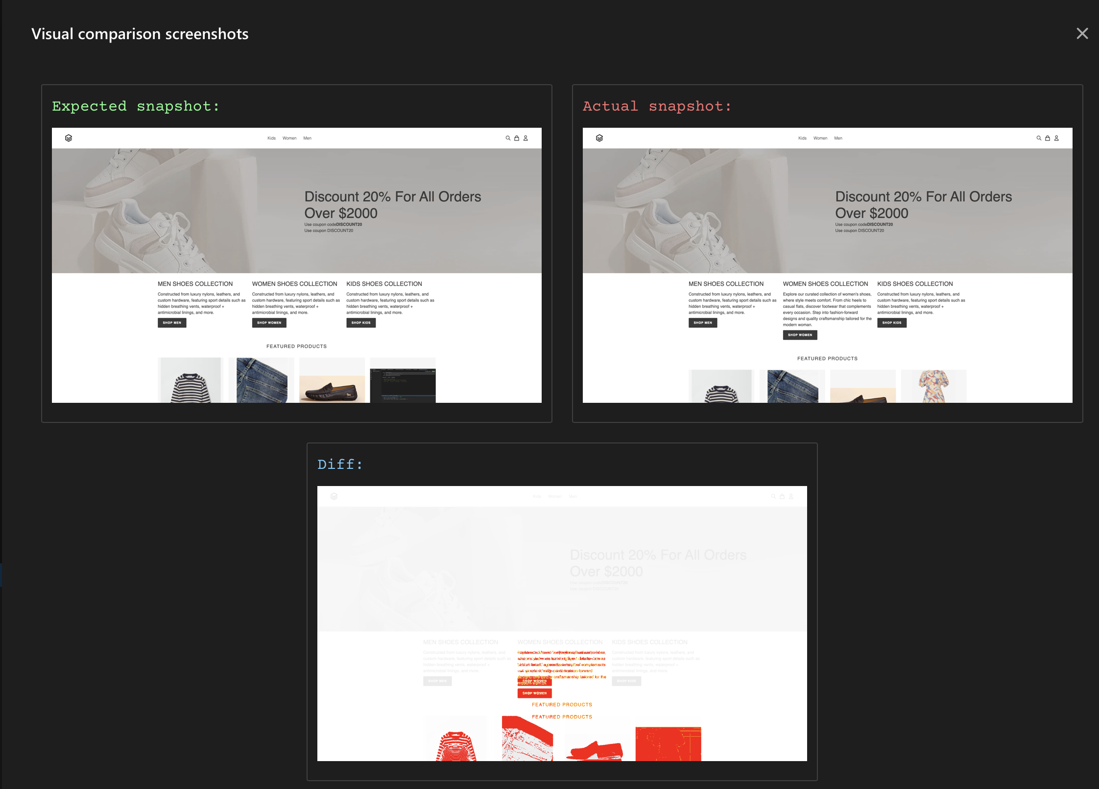 Identifies issues with alignments, colour changes, position changes, font styling issues, image rendering and positioning, UI components rendering and many other styling issues. The report rendered gives a clear indication of the errors. The library also allows to set threshold values to define how much of a difference would be acceptable for the visual comparison to not fail.